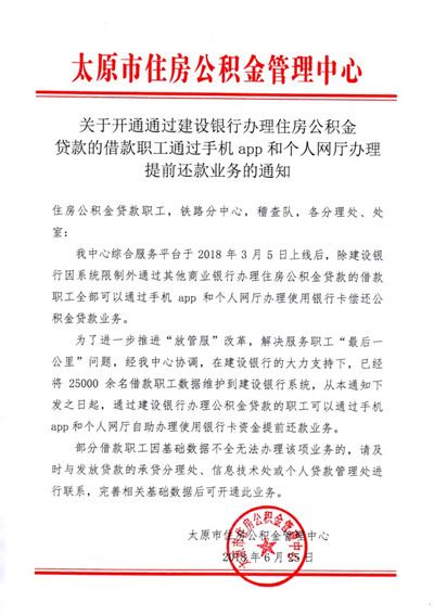 關(guān)于開通通過建設(shè)銀行辦理住房公積金貸款提前還款業(yè)務(wù)的通知