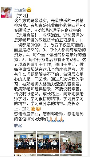 在HR成長學(xué)社,你總能看到有這樣積極向上的人,他們知識底蘊深厚,從不藏著掖著,善于展示自己,同時也活躍了整個課堂氣氛,大家總能在輕松愉悅的氛圍中學(xué)到知識。和這樣一群******的人一起成長,何樂而不為?如果您想認識******的新朋友,如果您剛好想學(xué)新知識,如果您對HR相關(guān)知識感興趣,如果您想更上一層樓,那就趁現(xiàn)在趕快加入我們吧?關(guān)注下方二維碼,及時掌握課程動態(tài)!