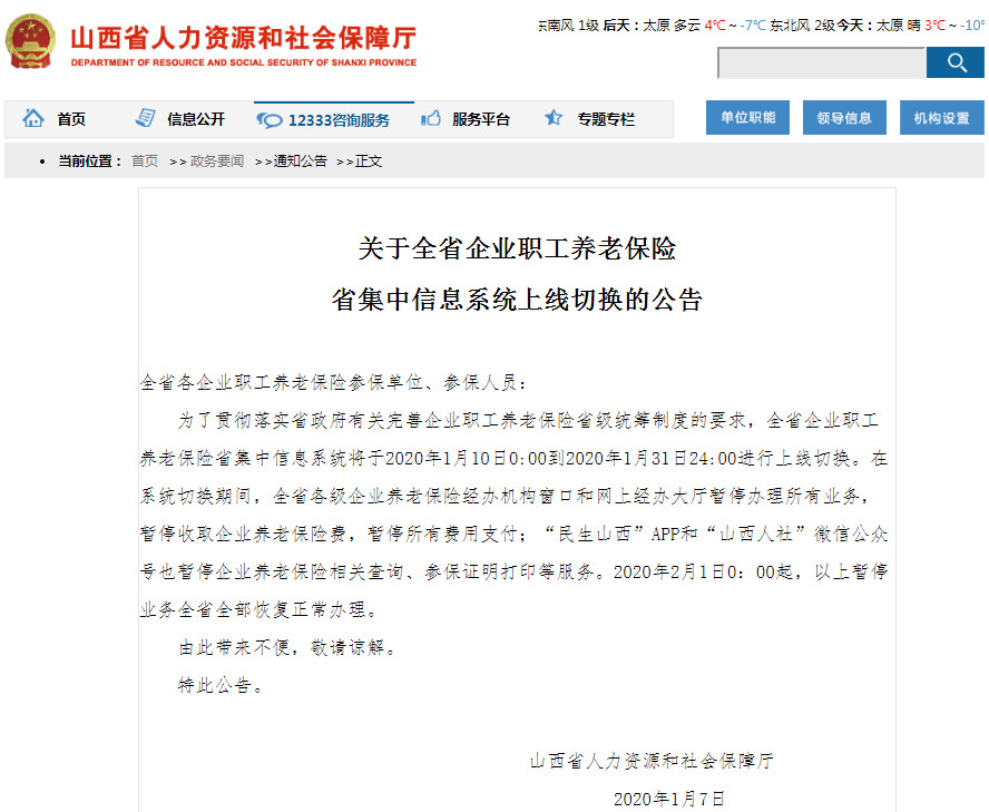 省人社廳1月7日發(fā)布公告,為貫徹落實省政府有關(guān)完善企業(yè)職工養(yǎng)老保險省級統(tǒng)籌制度的要求,1月10日0:00到1月31日24:00,全省企業(yè)職工養(yǎng)老保險省集中信息系統(tǒng)將進(jìn)行上線切換。