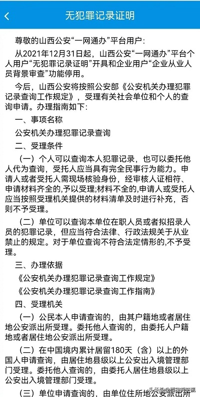 從2021年12月31起,平臺個(gè)人用戶“無犯罪記錄證明”開具和企業(yè)用戶“企業(yè)從業(yè)人員背景審查”功能停用。