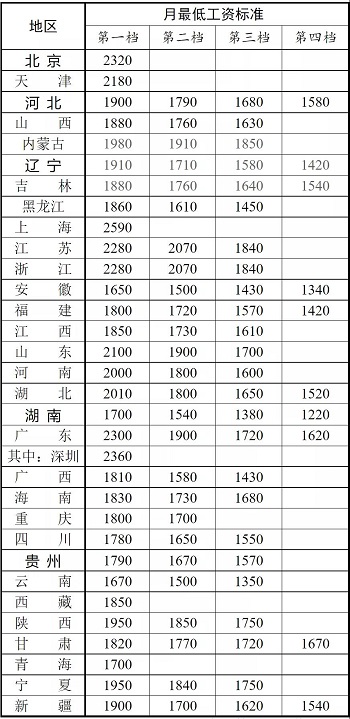全國各地區(qū)月******工資標(biāo)準(zhǔn)情況