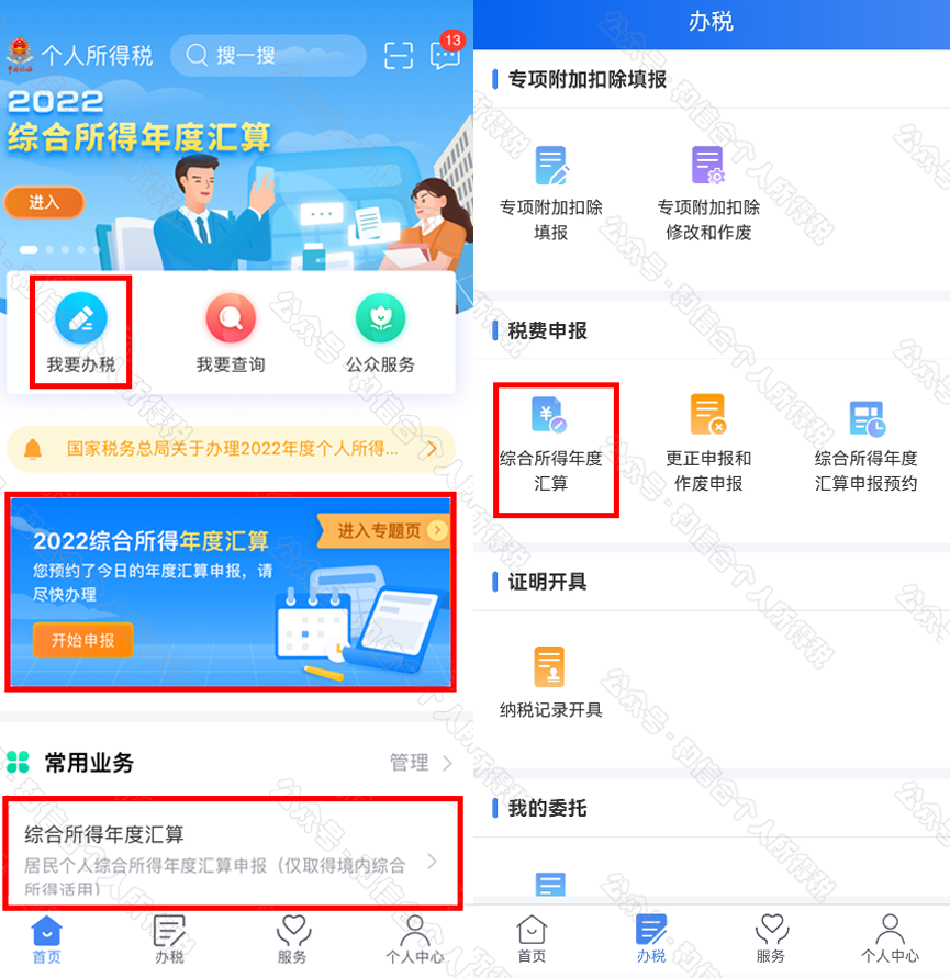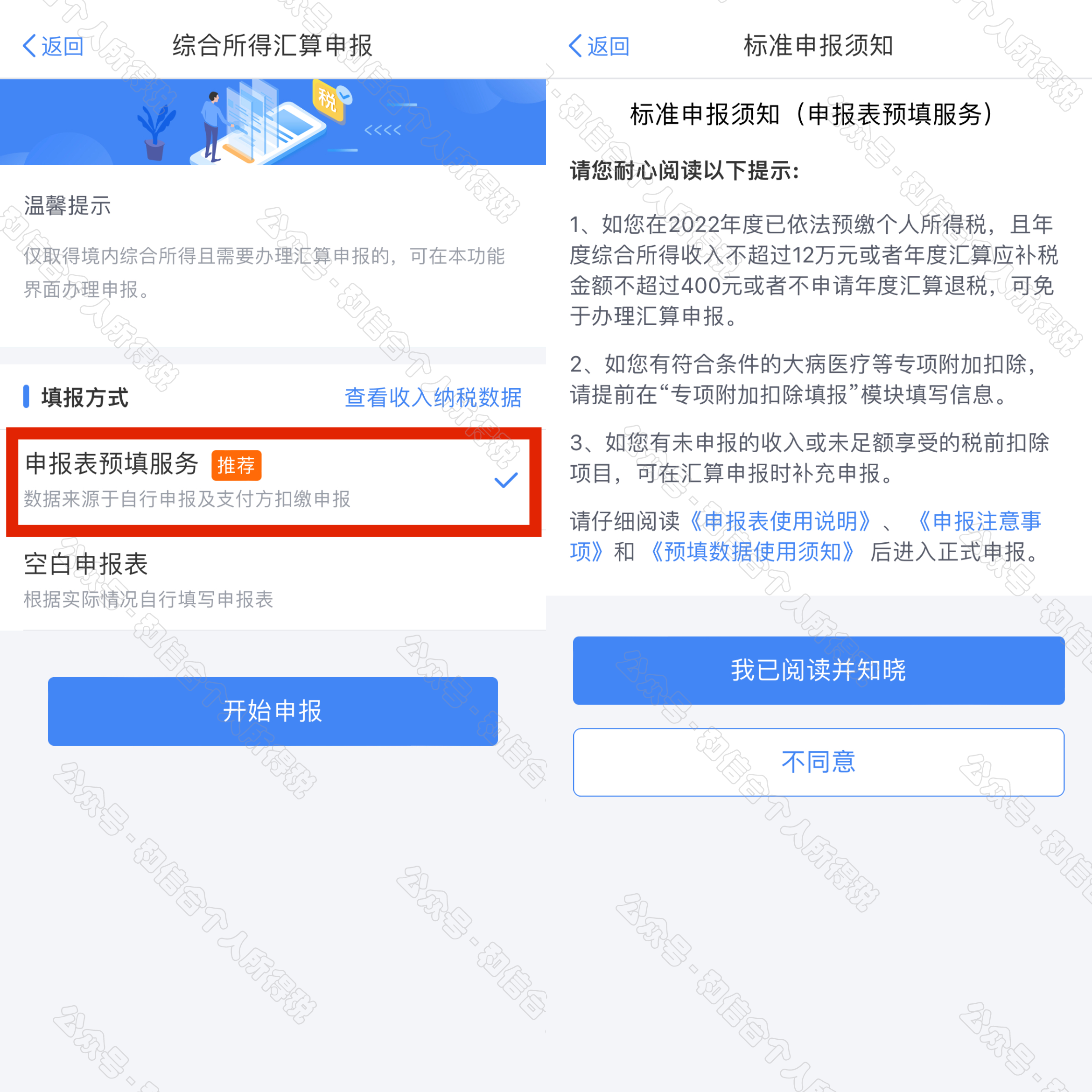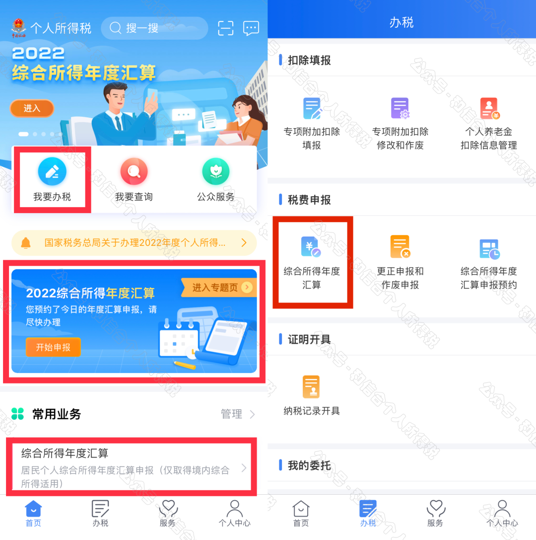 一是從首頁中間部位【2022綜合所得年度匯算】-【開始申報(bào)】進(jìn)入;