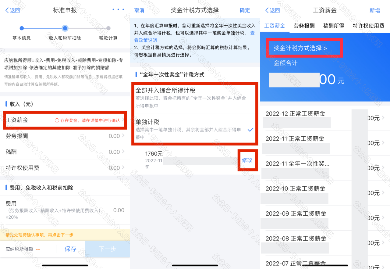 年度匯算時(shí),如您選擇將全年一次性獎(jiǎng)金合并至綜合所得計(jì)稅的,或者有多筆全年一次性獎(jiǎng)金的,可通過【獎(jiǎng)金計(jì)稅方式選擇】進(jìn)行設(shè)置。
