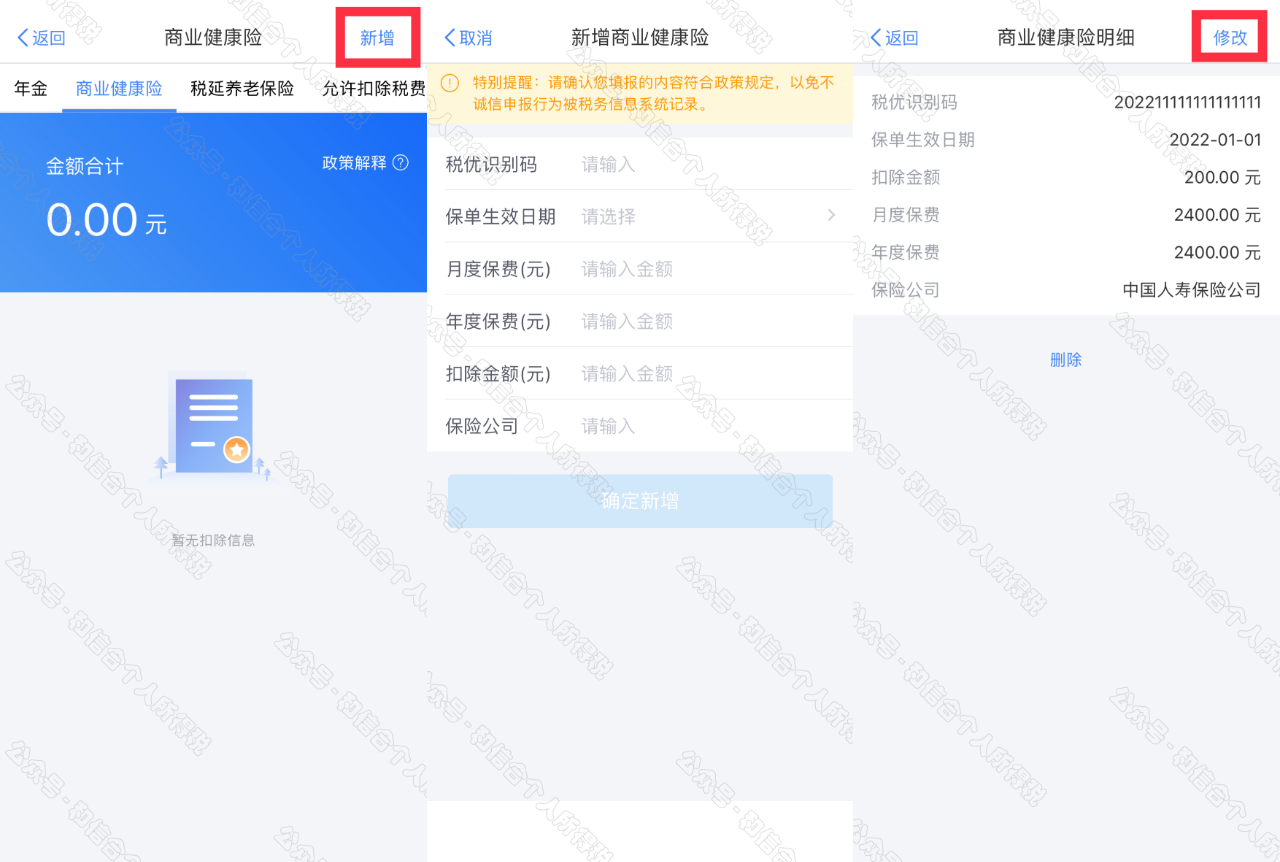 在其他扣除明細(xì)列表界面,您可點(diǎn)擊【商業(yè)健康險(xiǎn)】、【稅收遞延養(yǎng)老保險(xiǎn)】頁面,分別進(jìn)行新增和修改。