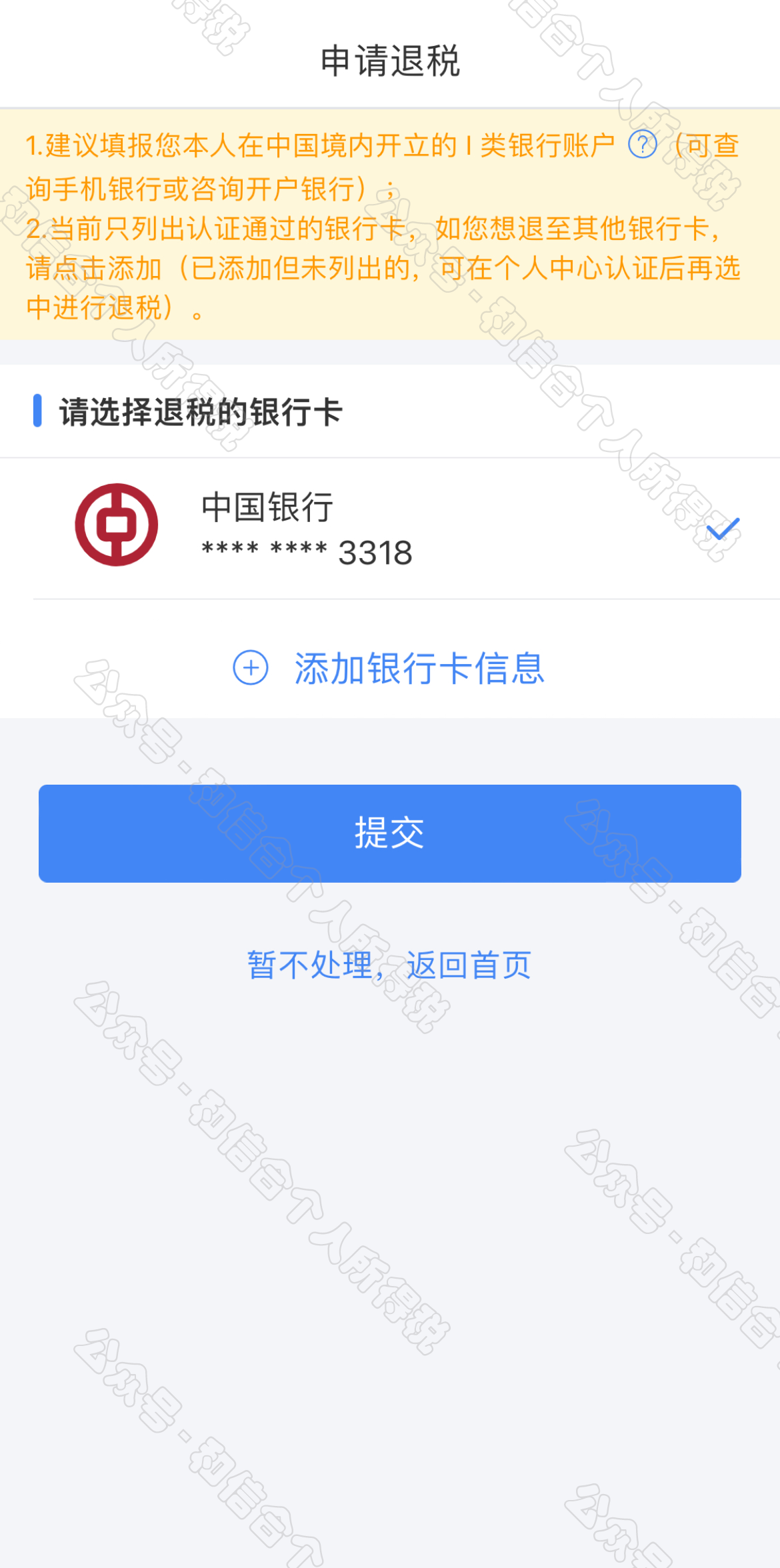 如果您的銀行卡不在身邊,或者暫時(shí)不想退稅,可以點(diǎn)擊【暫不處理,返回首頁】,后續(xù)可再次發(fā)起退稅申請(qǐng)。