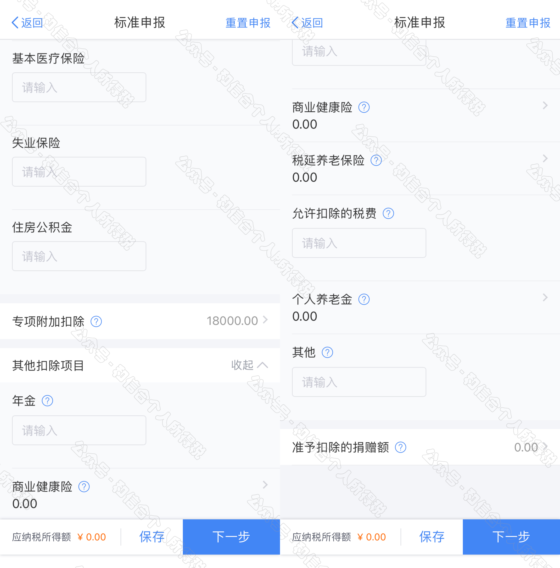 商業(yè)健康險(xiǎn)、稅收遞延養(yǎng)老保險(xiǎn)、準(zhǔn)予扣除的捐贈(zèng)額、減免稅額需先填寫附表,填寫后相關(guān)信息帶入主表。主表不能直接填寫。