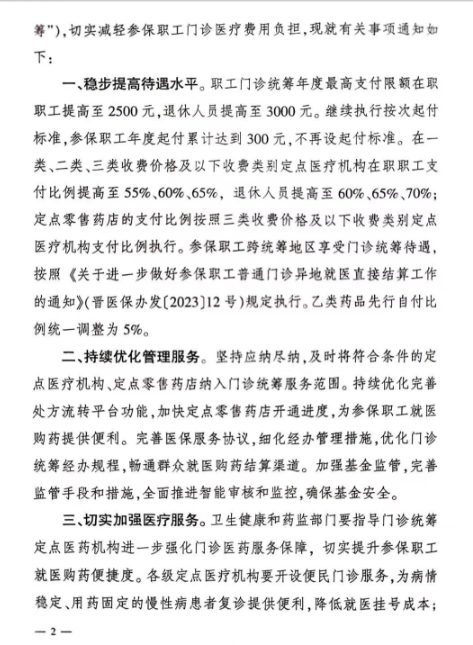 2024年7月1日起施行,完善職工基本醫(yī)療保險(xiǎn)普通門診統(tǒng)籌政策:在職職工提高至2500元,退休人員提高至3000元。