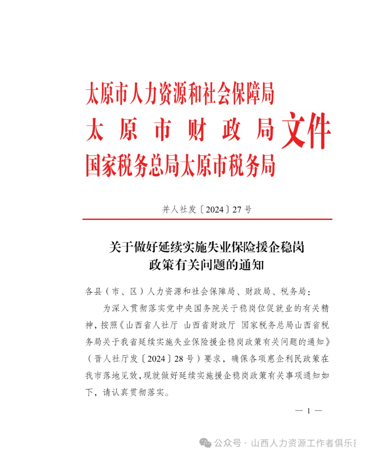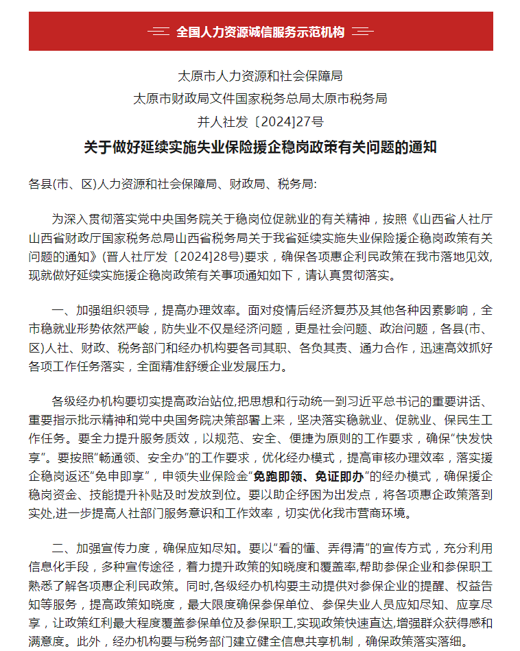 太原市文件:關(guān)于做好延續(xù)實(shí)施失業(yè)保險(xiǎn)援企穩(wěn)崗政策有關(guān)問題的通知(附紅頭文件)