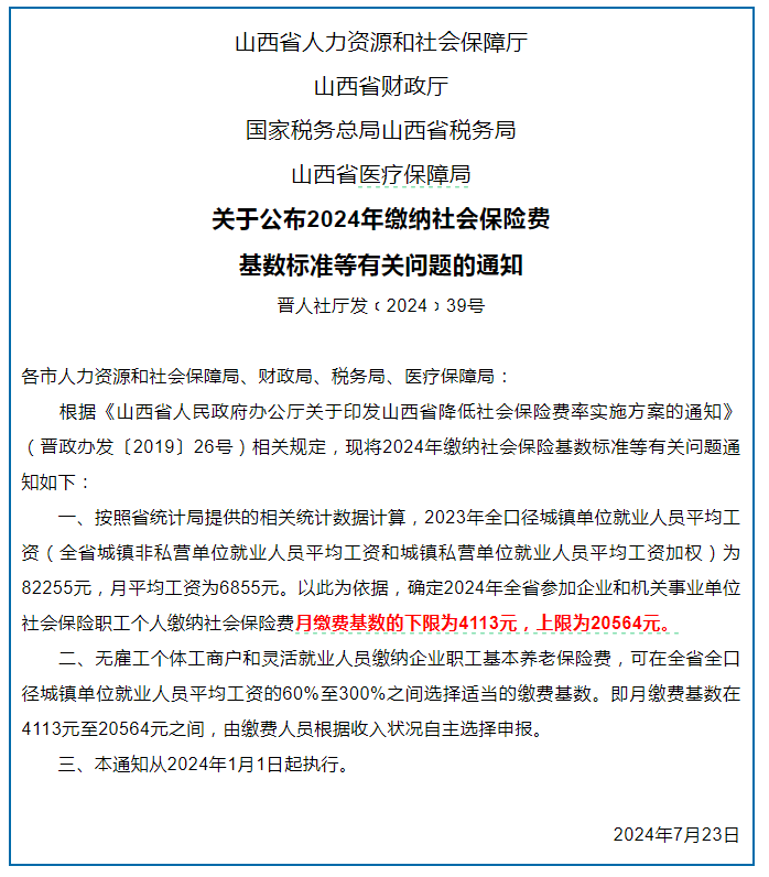 關(guān)于公布2024年繳納社會保險費基數(shù)標準等有關(guān)問題的通知